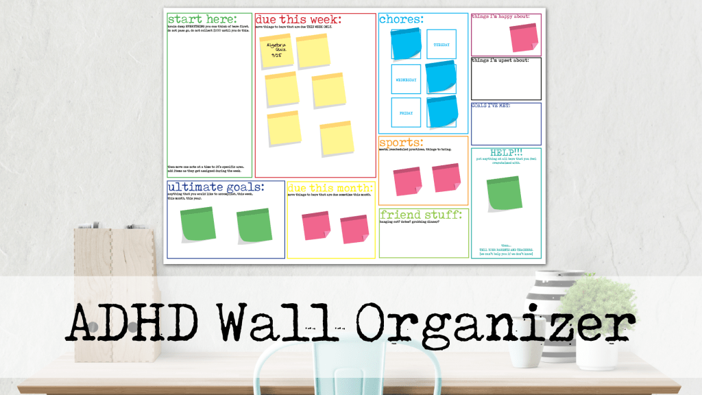 This board is 38″ x 25″, laminated cardstock, divided into chunked categories. For him we have: Start here (brain dump station), Due this week, Due this month, Ultimate goals, Chores, Sports, Friend Stuff, Things I’m happy about, Things I’m upset about, Goals I’ve met and HELP! Want it? Download it for free right now below!