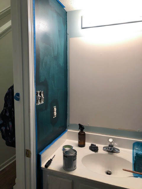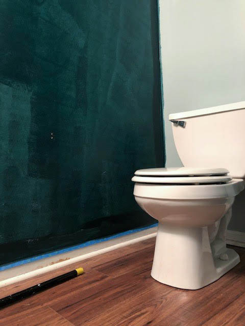 I am a creative. My styles ebb and flow like the ocean and you can probably find pieces of rustic farmhouse, kitsch, modern, traditional, casual and more throughout our house. I’d lump it all together as eclectic. But not in that “My grandma’s eclectic…” style. 99% of the art in our house is something I designed and then I just find things [dollar store, goodwill, thrift shop things] that go with it. For this bathroom – and I have no idea why – I was obsessed with these deep, dark, greenblack colors.