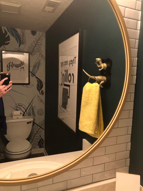 I knew I wanted a pop of color or design or something on the wall behind the toilet to that would be reflected back by the mirror to make the room appear larger than it is. I will say, yes, I’m lucky I’m a graphic designer and can just design and print my own wallpaper. If you’re not creative in that way, it’s still very easy to get a sheet or two of custom designed wallpaper. In fact, you can get it right here. And if that’s not in the budget – which is still pretty low- paint a stencil over one wall or cover it in Dollar Store framed pictures or art. Anything to break up the dark walls and give dimension.