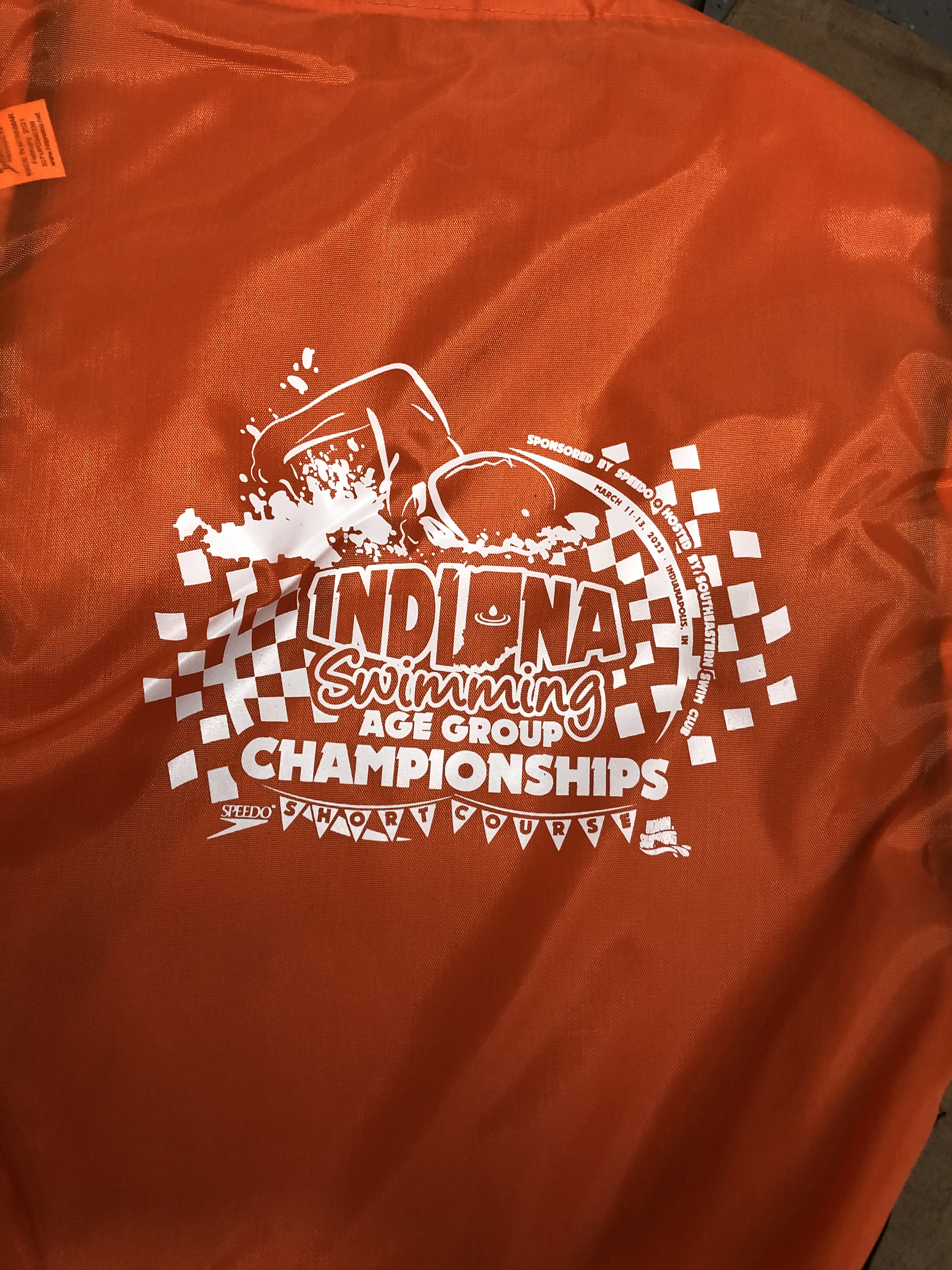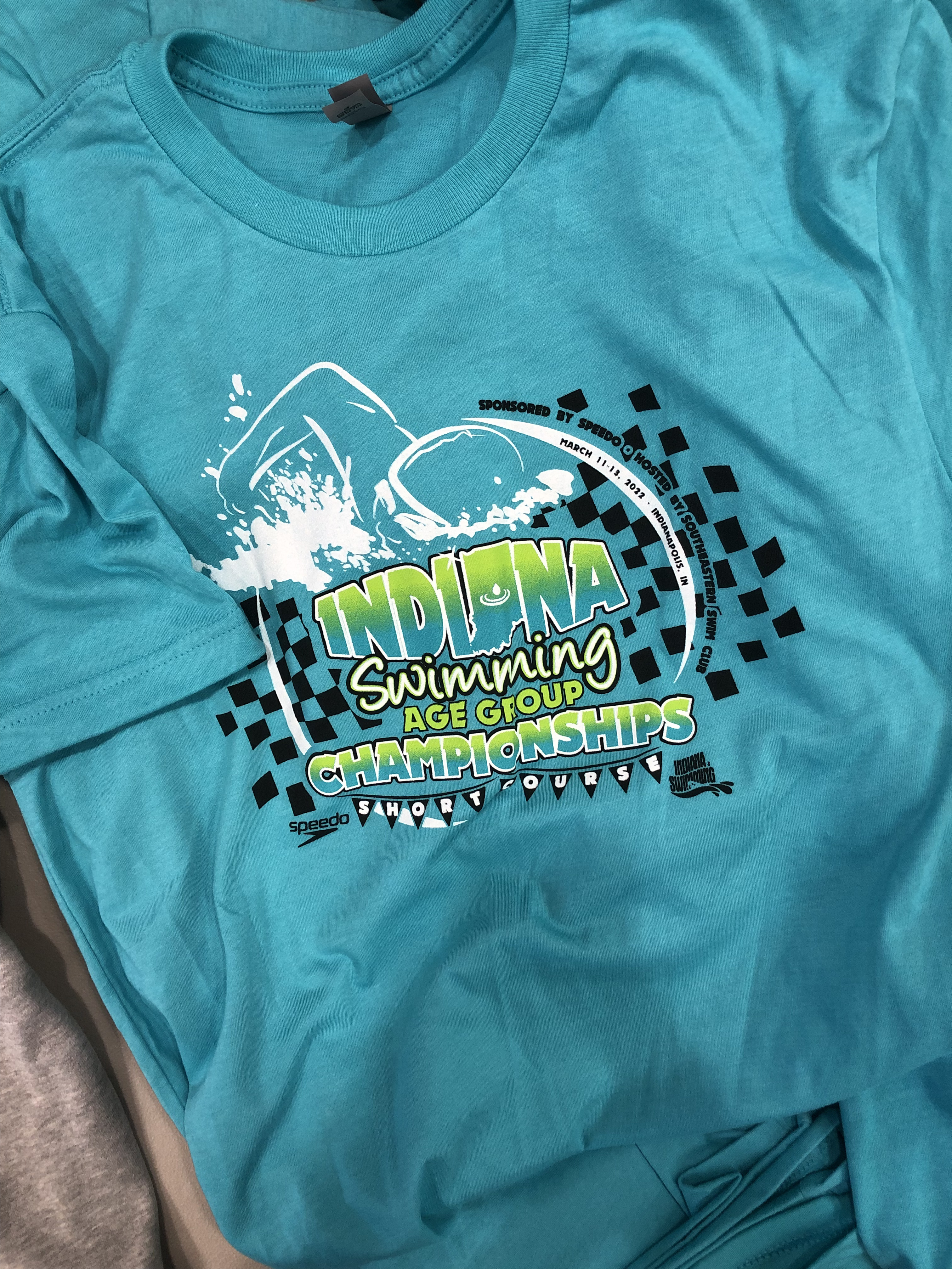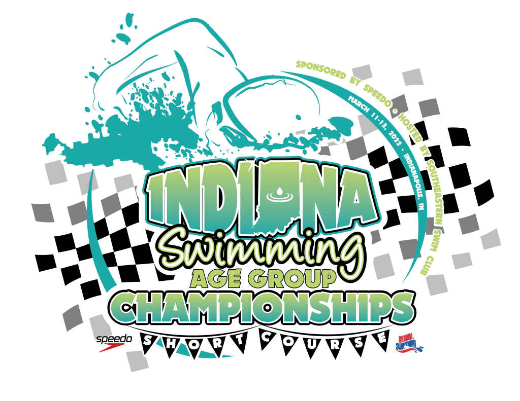 In 2022, the racing icon that is Indianapolis, was the base for my concept and the checkered flag so iconic at the Indy 500 plays in the background evoking the spirit of racing. The water and ripples in the Indiana designate our central state location while the state icon stands in for the “A”. “A” being identified in a similar shape as well as eluding to #1. The bright teal and lime green pop against all platforms and give a watery sense of styling. The short course flags stand in for a traditional tag line but use the swimming standard of flags which every swimmer knows well.